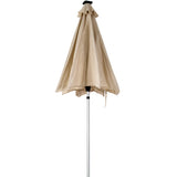 PEDESTAL ARTICULADO. Sombrilla de 2.7 metros de diámetro de apertura con brazo central articulado y una altura máxima de 2.37 metros. Esta fabricada con una estructura de acero y tela poliéster semi impermeable que impide la entrada directa de luz solar y es resistente contra lluvia ligera.